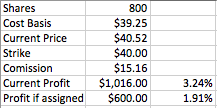 Commission and fees came to $13.61 so I have a cost basis of $57.7226. There are only two weeks left in the calls and I expect to be able to write at least twice a month against this underlying. At this point I have approximately half of my retirement funds in this IRA and the rest will stay in my 401(k) until retirement.